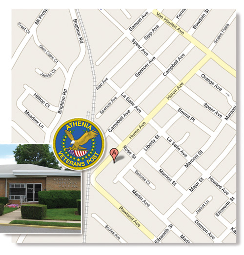 From Rte. 46 East: Exit at Van Houten Ave. • At end of exit turn right at stop sign • Turn left at traffic light onto Van Houten Ave. • Go through 3 traffic lights • At traffic light 4, turn right onto Huron Ave., the Athenia Veterans Post is down the road on left side.