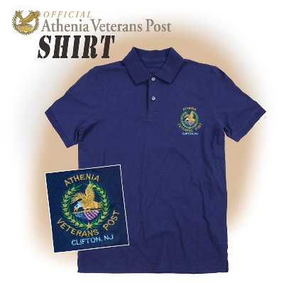 The Official Shirt of the Athenia Veterans Post is available for our members only. They are navy blue with the colorful embroidered emblem sewn in and come in various sizes, S, M, L and XL for the price of $20.00 each. There is also an XXL size for $22.00 each. We're hoping that every member would be proud to wear this shirt to show their support of the AVP.